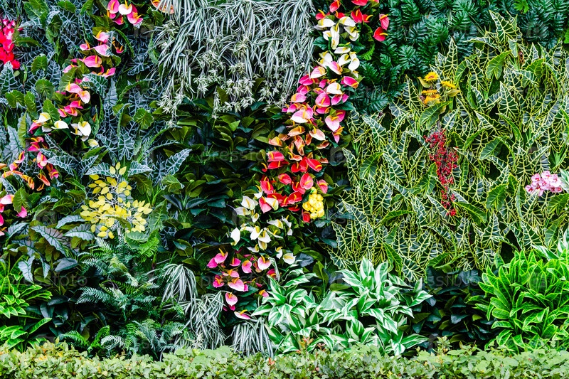 Гирлянды из живых цветов на зеленых кустах и деревьях