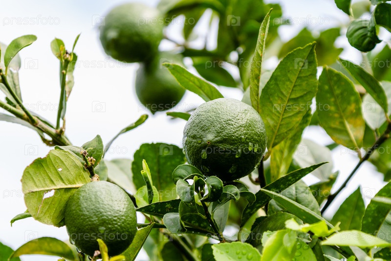 Влажные зеленые плоды лайма на ветке дерева после дождя