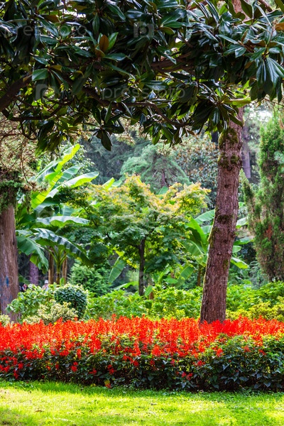 Красная клумба, освещенная солнцем в городе Батуми