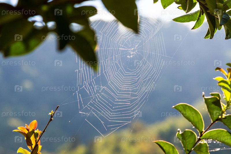 Паутина, освещенная солнцем, крупным планом в горах