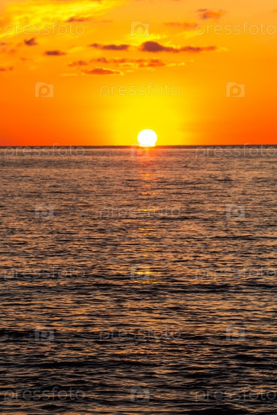 Заходящее солнце в оранжевом небе над Черным морем в Батуми