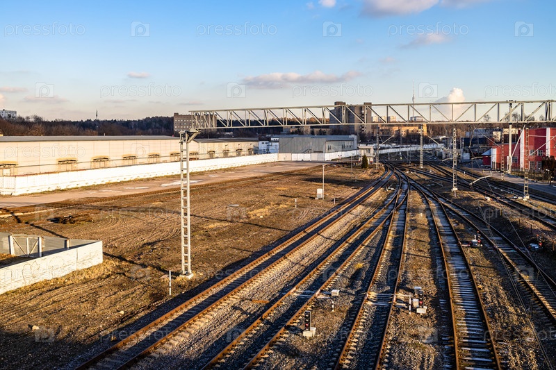 Железнодорожный тупик, освещенный закатным солнцем осенью