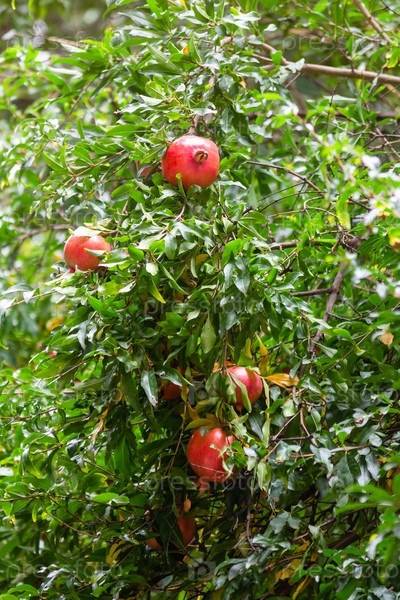 Красные плоды граната на зеленом дереве в Тбилиси
