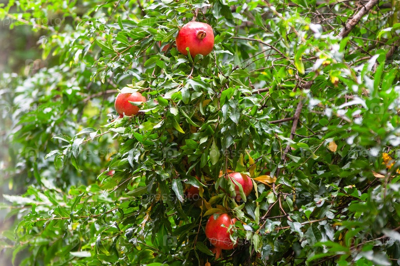 Спелые плоды граната на зеленом дереве в Тбилиси