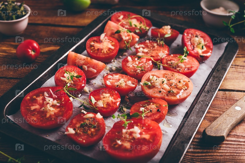 Приготовление томатного варенья на оливковом масле с тимьяном и чесноком на форме для запекания