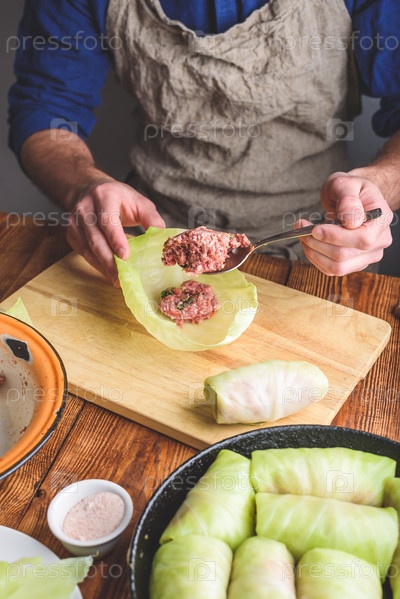 Мужчина готовит голубцы с фаршированным мясом на кухне