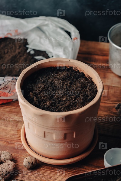 Глиняный горшок, полный почвы и посеянных семян тимьяна