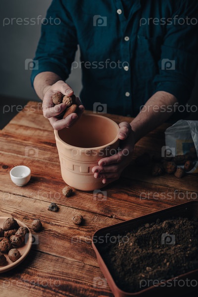 Мужчина кладет глиняные камешки на дно терракотового горшка