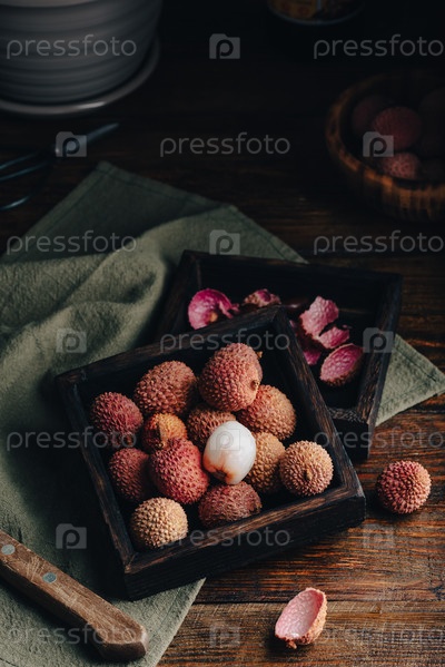 Плоды личи в деревянном контейнере
