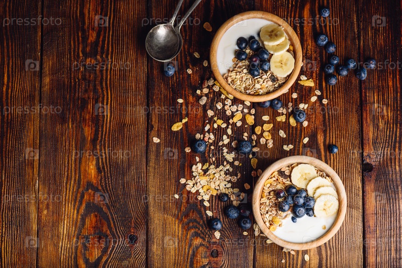 Завтрак с гранолой, бананом и черникой