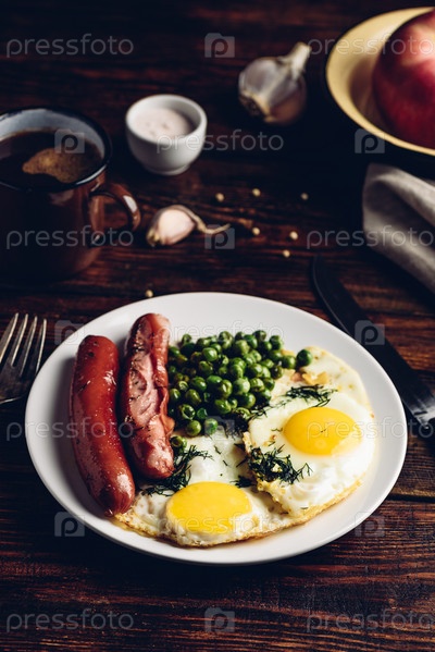 Завтрак с яичницей, сосисками и зеленым горошком