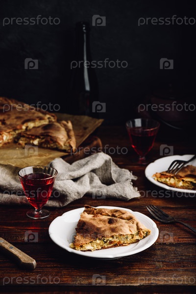 Кусок капустного пирога на белой тарелке