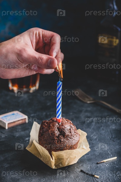 Ручная зажженная свеча на кексе на день рождения
