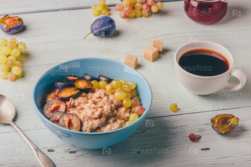 Каша со сливой, виноградом и чашкой кофе