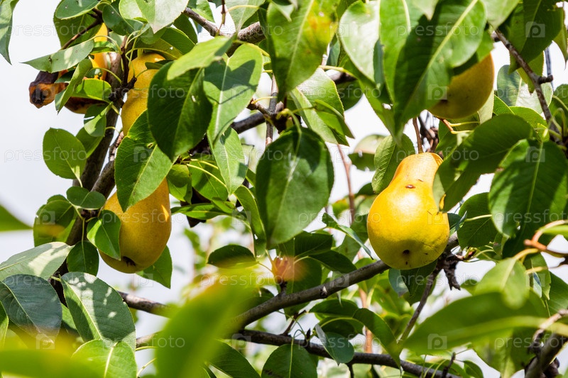 Спелые желтые плоды груши на ветвях грушевого дерева