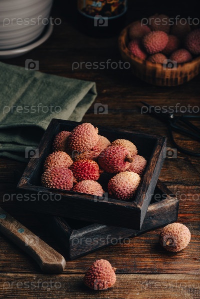 Плоды личи в деревянном контейнере