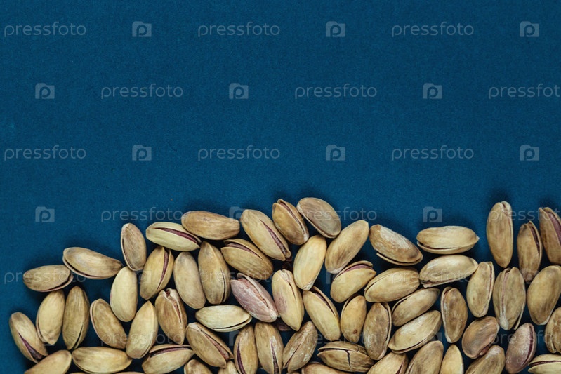 Орехи на синем фоне, вид сверху, пустое место для текста, концепция органического здорового питания