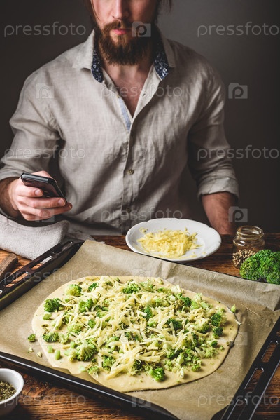 Мужчина пользуется телефоном во время приготовления пищи