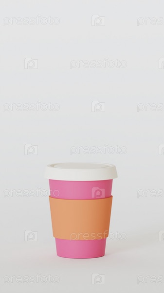 Розовый бумажный стаканчик на вынос, белый фон, 3D-рендеринг