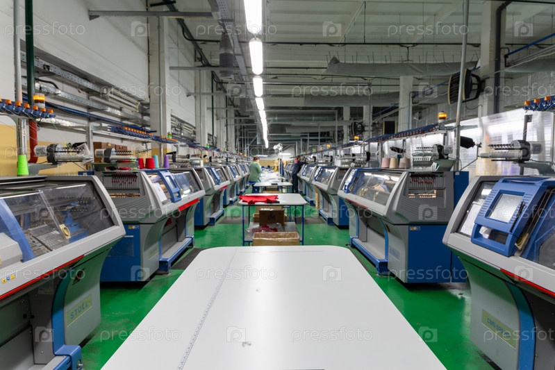 Ряд промышленных текстильных плосковязальных машин на трикотажной фабрике