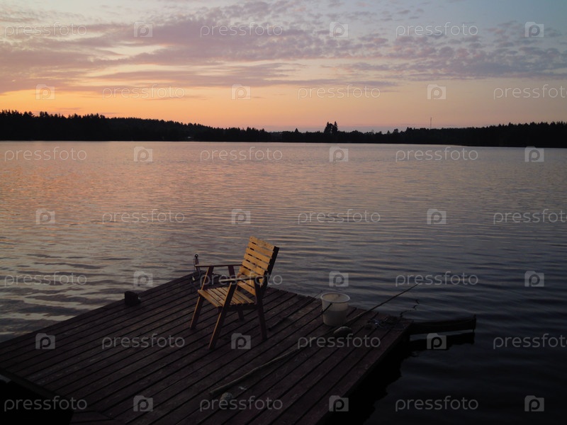 Закат Солнца на озере, рыбалка на мостках