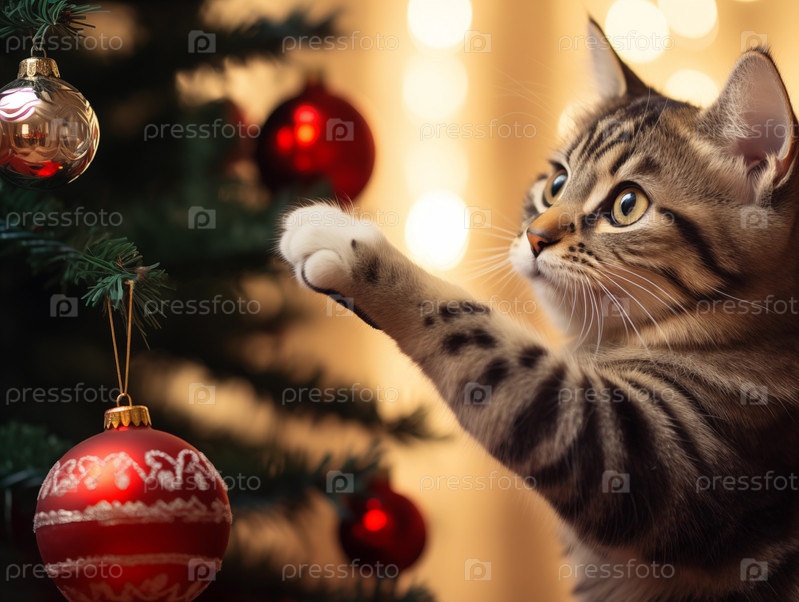 Кошка играет с игрушкой на елке