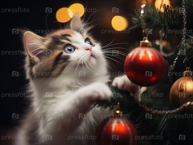 Котенок играет с игрушкой на елке