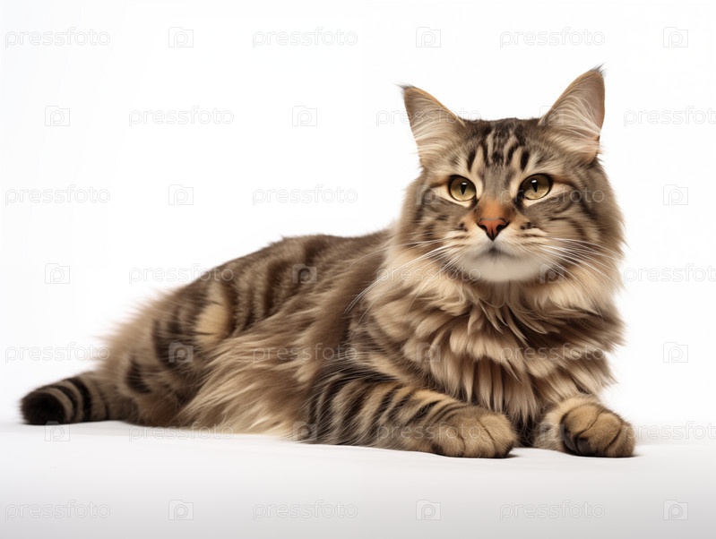 Серый длинношерстный кот лежит на белом фоне