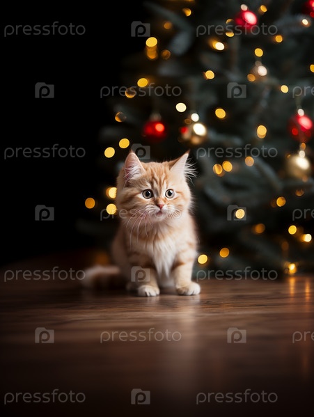 Котенок сидит перед елкой