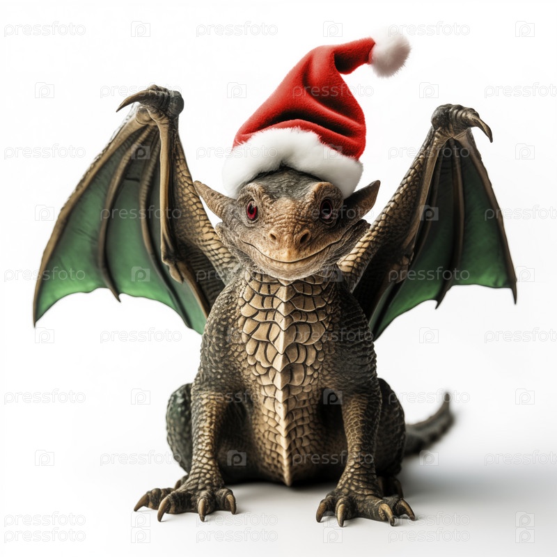 Милый зеленый дракон с крыльями и в рождественской шапке