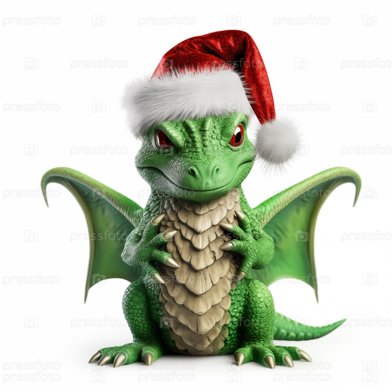 Милый зеленый дракон с крыльями и в рождественской шапке