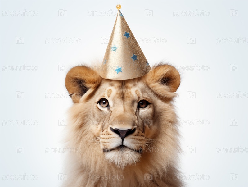 Лев в праздничной шапке на белом фоне