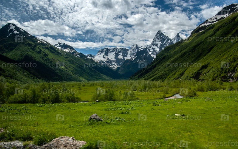 Долину с невысокими березками окружают лесистые горы и снежные скалы. Речка Кичи-Муруджу. Гоначхирское ущелье, Военно-Сухумская дорога, Карачаево-Черкессия, Россия.