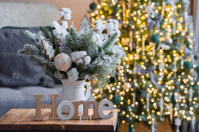 Букет елей с ватой и игрушками и домашний знак на столе на фоне елочных гирлянд. Зимние украшения в интерьере. Концепция новогодних праздников 2024
