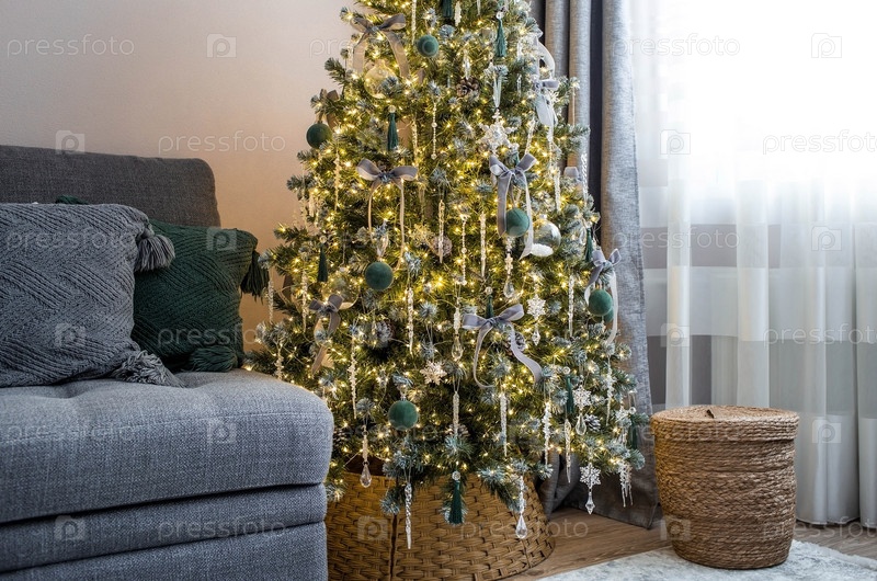 Уютный декор в серо-зеленых тонах в интерьере новогодней комнаты, елка, украшенная хрустальными игрушками и гирляндами. Праздничная гостиная в доме. Новогодние каникулы 2024
