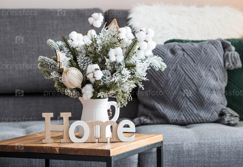 Букет елей с ватой и игрушками и домашний знак на столе на фоне елочных гирлянд. Зимние украшения в интерьере. Концепция новогодних праздников 2024