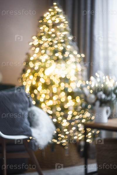 Абстрактный размытый свет боке. Уютный декор в интерьере новогодней комнаты, елка, украшенная гирляндами. Праздничная гостиная в доме. Красивый новогодний фон 2024 года
