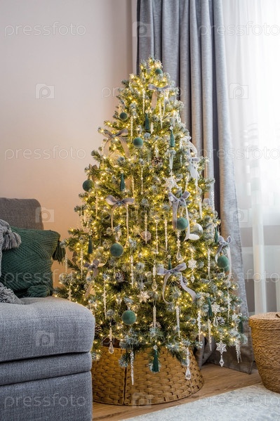 Уютный декор в серо-зеленых тонах в интерьере новогодней комнаты, елка, украшенная хрустальными игрушками и гирляндами. Праздничная гостиная в доме. Новогодние каникулы 2024