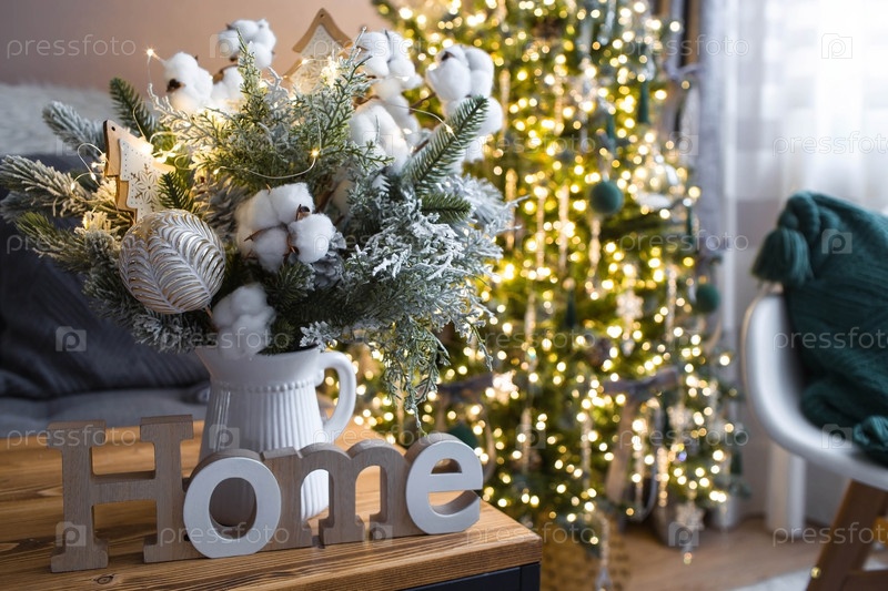 Уютный декор в серо-зеленых тонах в интерьере новогодней комнаты, елка, украшенная хрустальными игрушками и гирляндами. Праздничная гостиная в доме. Новогодние каникулы 2024