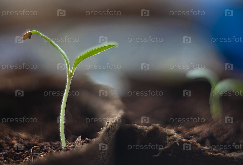 Один маленький саженец помидора в торфяном горшке, очень крупный план