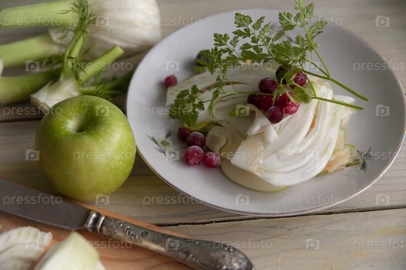 Домашний салат из свежего фенхеля на зеленом и желтом фоне, плоская планировка. Салат с фенхелем, зеленым яблоком, кервелем, клюквой и оливковым маслом хорош для весеннего и зимнего рациона