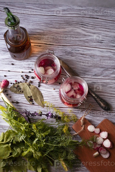 Две стеклянные банки с маринованной редькой с зеленью, чесноком, уксусом и специями на белом деревянном столе, плоская планировка