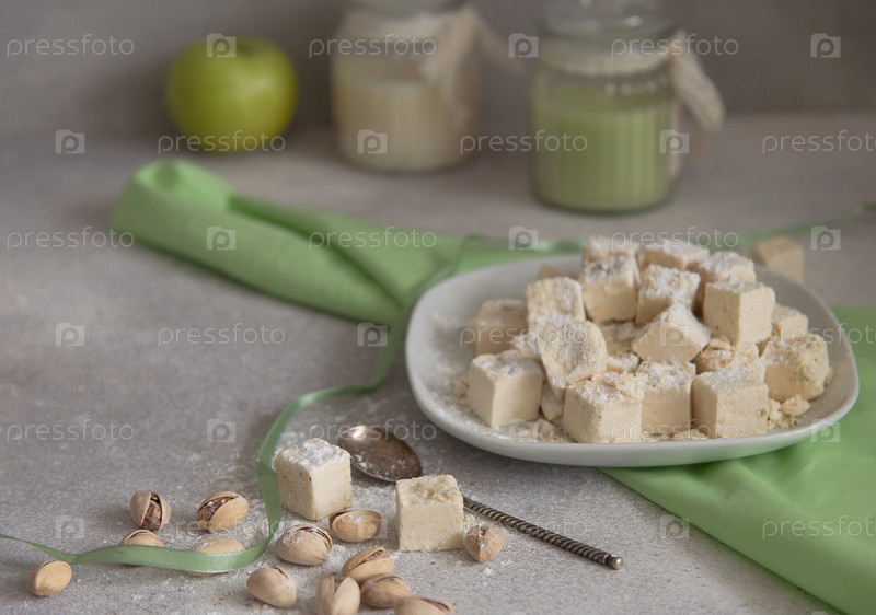 Фисташковая халва на тарелке с фисташковыми орехами