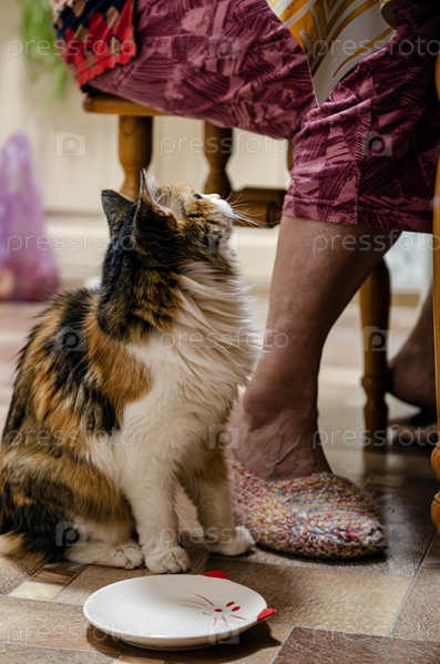 Домашняя кошка возле пустой тарелки, глядя на ноги хозяина