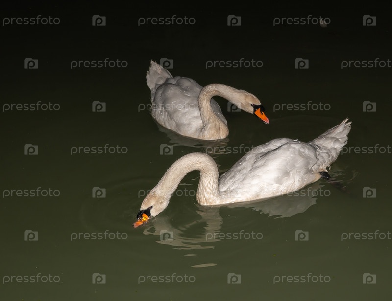 Пара белых лебедей выплывает из темноты ночного озера. Лебединое озеро, Новый Афон, Абхазия