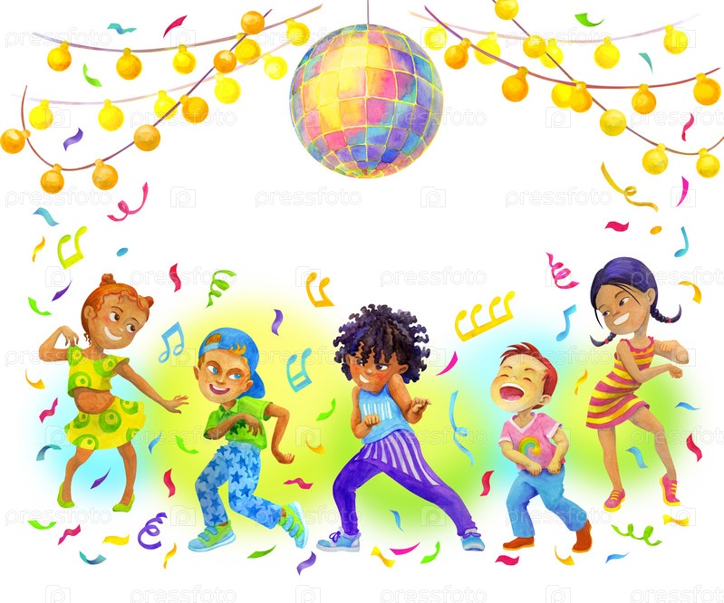 Рамка со счастливыми мальчиками и девочками, весело танцующими на детской вечеринке. Концепция празднования. Акварельная иллюстрация для дизайна открыток, приглашений, плакатов