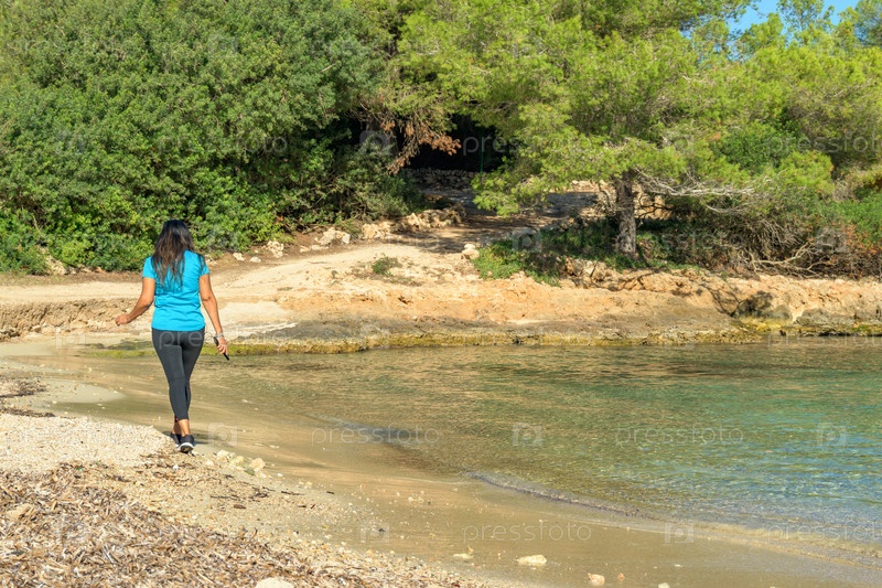 Латиноамериканская спортсменка, прогуливающаяся по берегу средиземноморского острова,