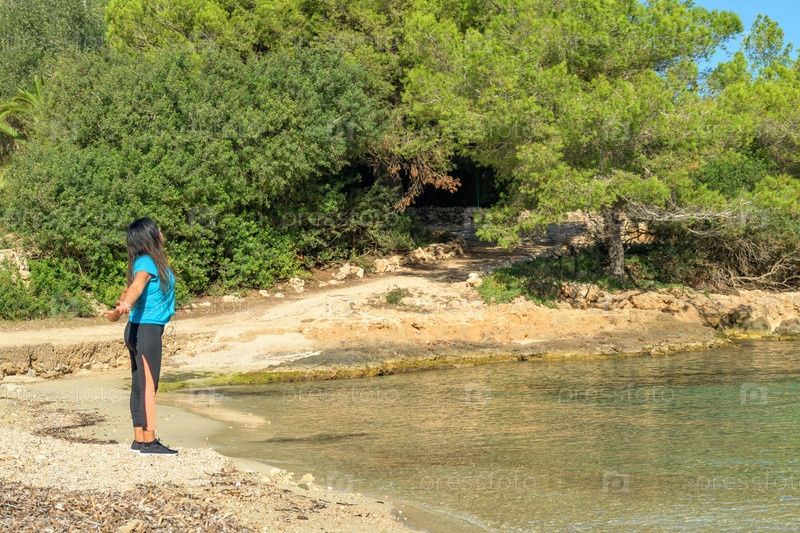Латиноамериканка, на берегу пляжа, смотрит на море и глубоко дышит,