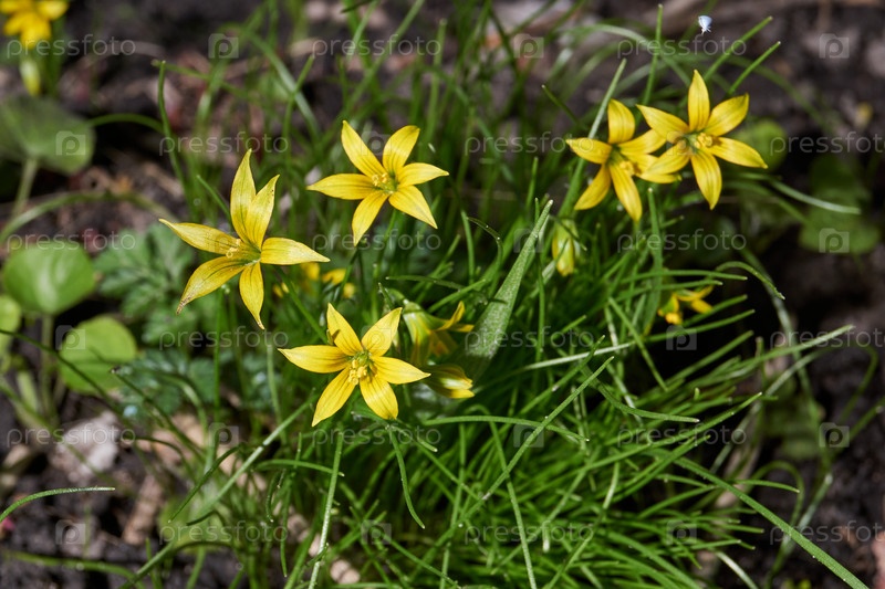 Весна. на грядке цветет Гусиный лук или Птичий лук (лат. Gagea)