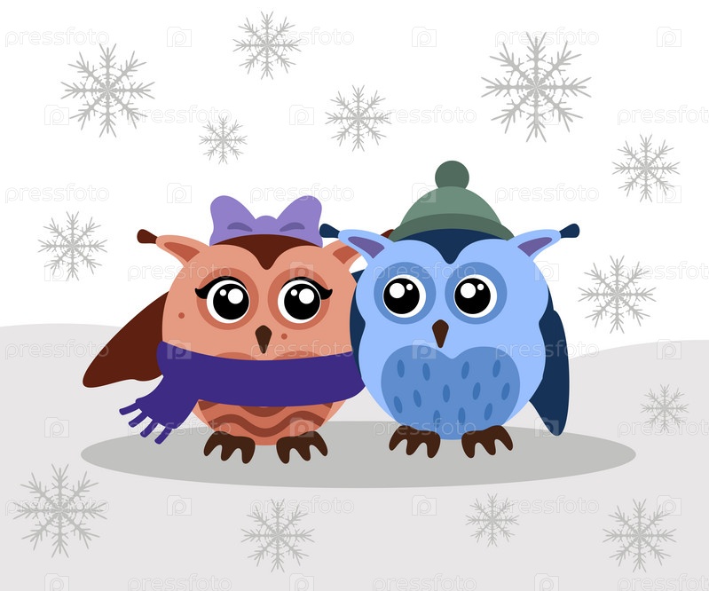 Новогодняя иллюстрация с парой сов со снежинками на простом светлом фоне для открытки